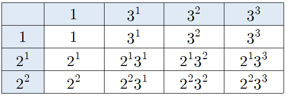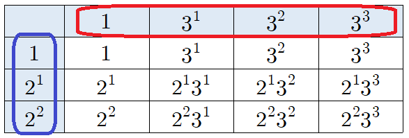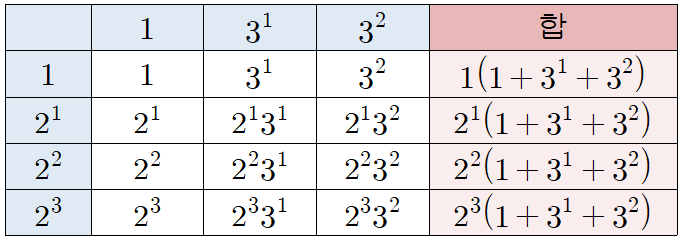 마찬가지로 소인수 3도 최대 3개까지는 쓸 수 있고, 안 쓸 수도 있습니다. 총 4가지 경우가 있죠.