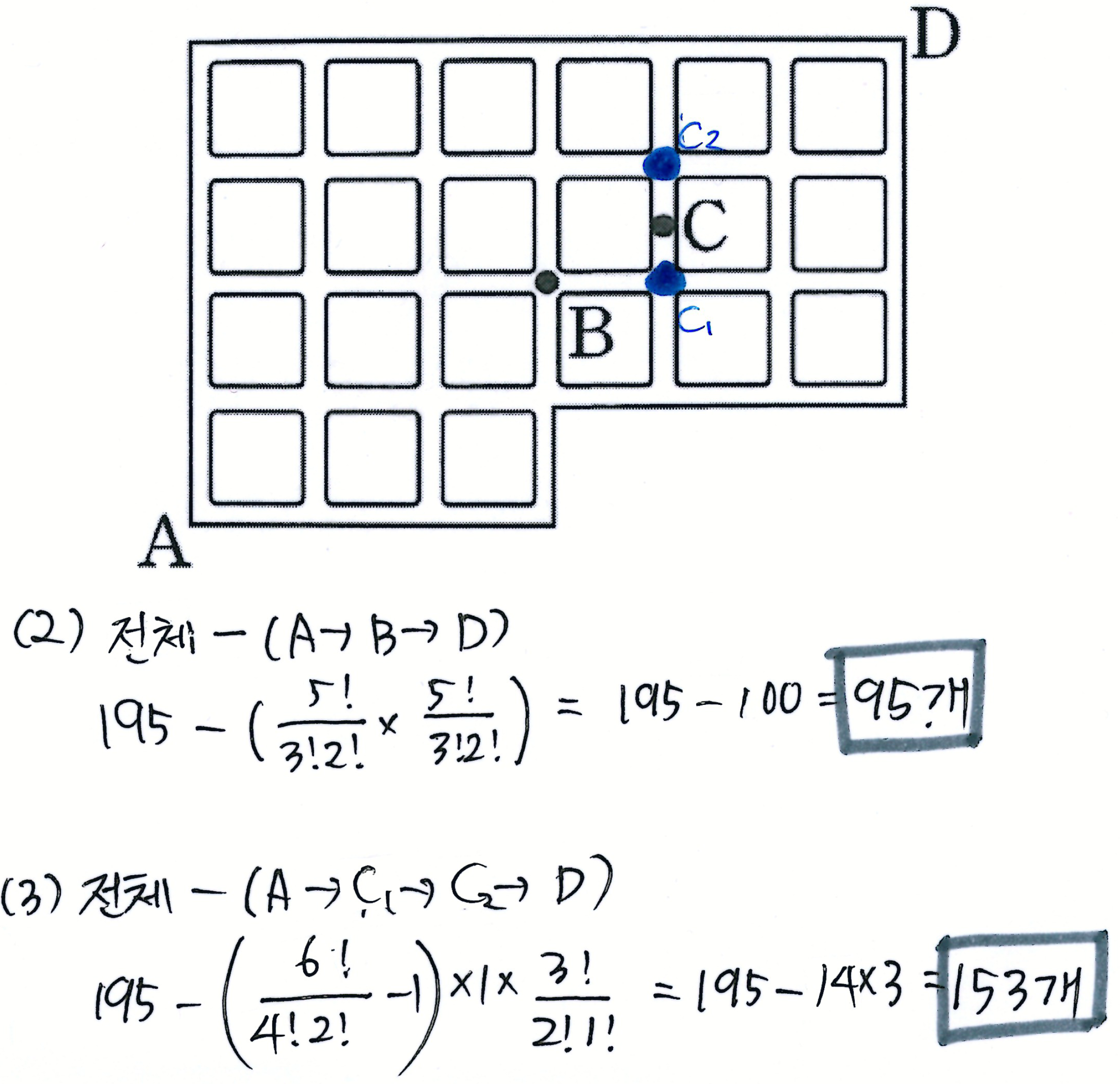 2. A에서 D로 가는 최단 경로 중 점 B를 지나지 않는 경로는 몇 가지인지 구하여라.