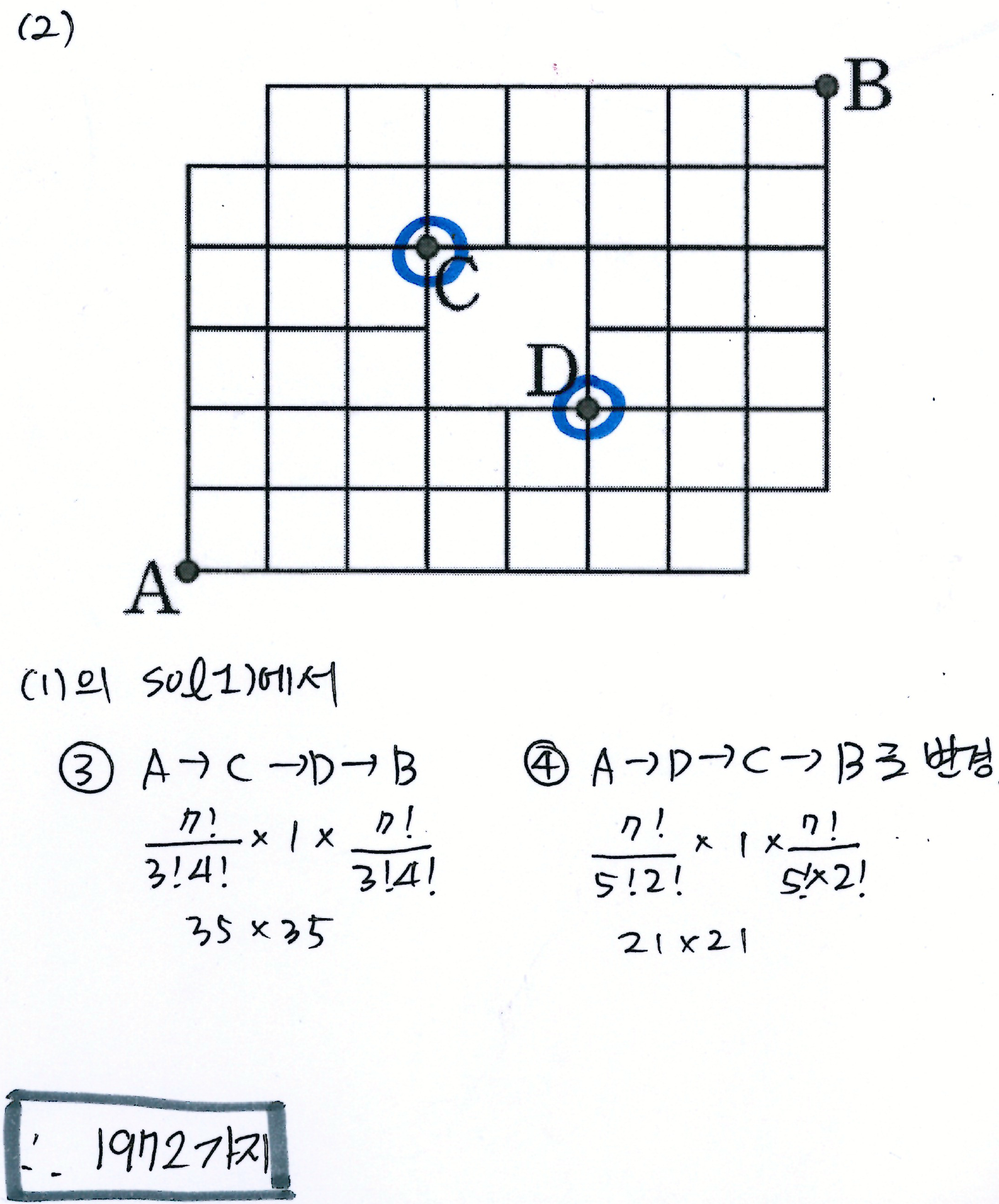 2. A에서 B까지 최단 거리로 가는 길을 잡을 때, C에 도착했을 때에는 D에서, D에 도착했을 때에는 C에서 다시 출발하고, C에서 D, D에서 C로 이동할 때의 방법의 수는 무시한다고 한다. 방법은 몇 가지인지 구하여라.