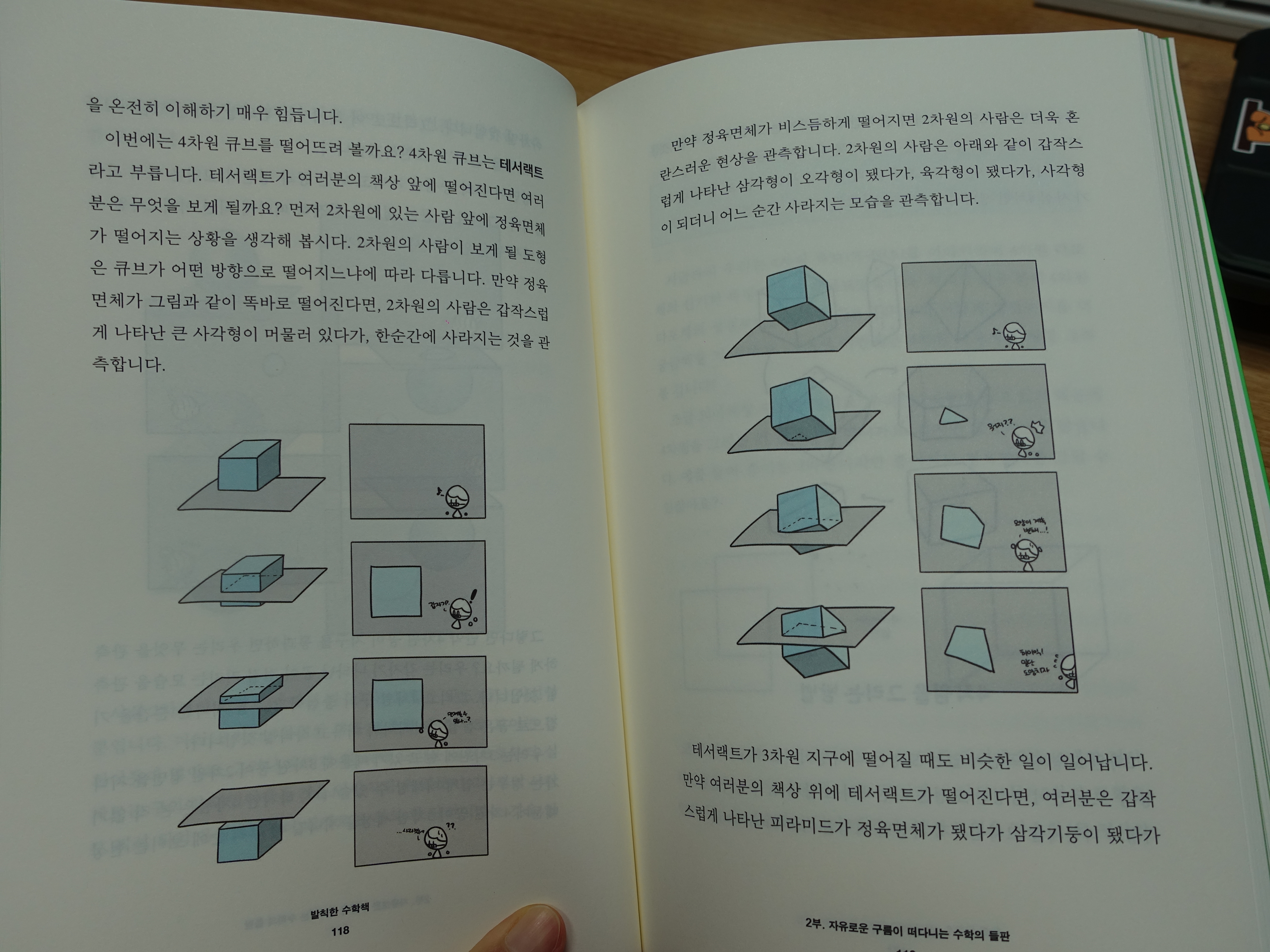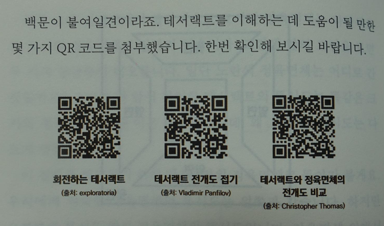 아, 그리고 차원에 대한 이해도 쉽게 설명해두었더라구요. 개인적으로 칼세이건의 4차원에 관한 설명과 방법적인 측면에서의 차이는 별로 없지만, 귀여운 그림과, 다양한 테서렉트의 모양을 QR 코드로 실어두어서 이해하는데 많은 도움을 주고 있죠.