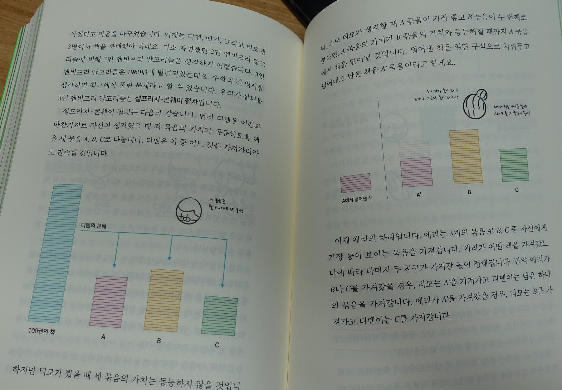 두 명이 서로 공정하게 무언가를 나눠 갖는 법은 많이들 알고 있죠. 그런데 여기서 인원이 한 명만 더 추가되면 꽤나 어려워집니다. 셀프리지 콘웨이 절차라고 해요. 말로만 나와있는 게 아니고, 돌아가면서 그림으로도 설명해줘서 이해가 쉽게 되는 편이에요.