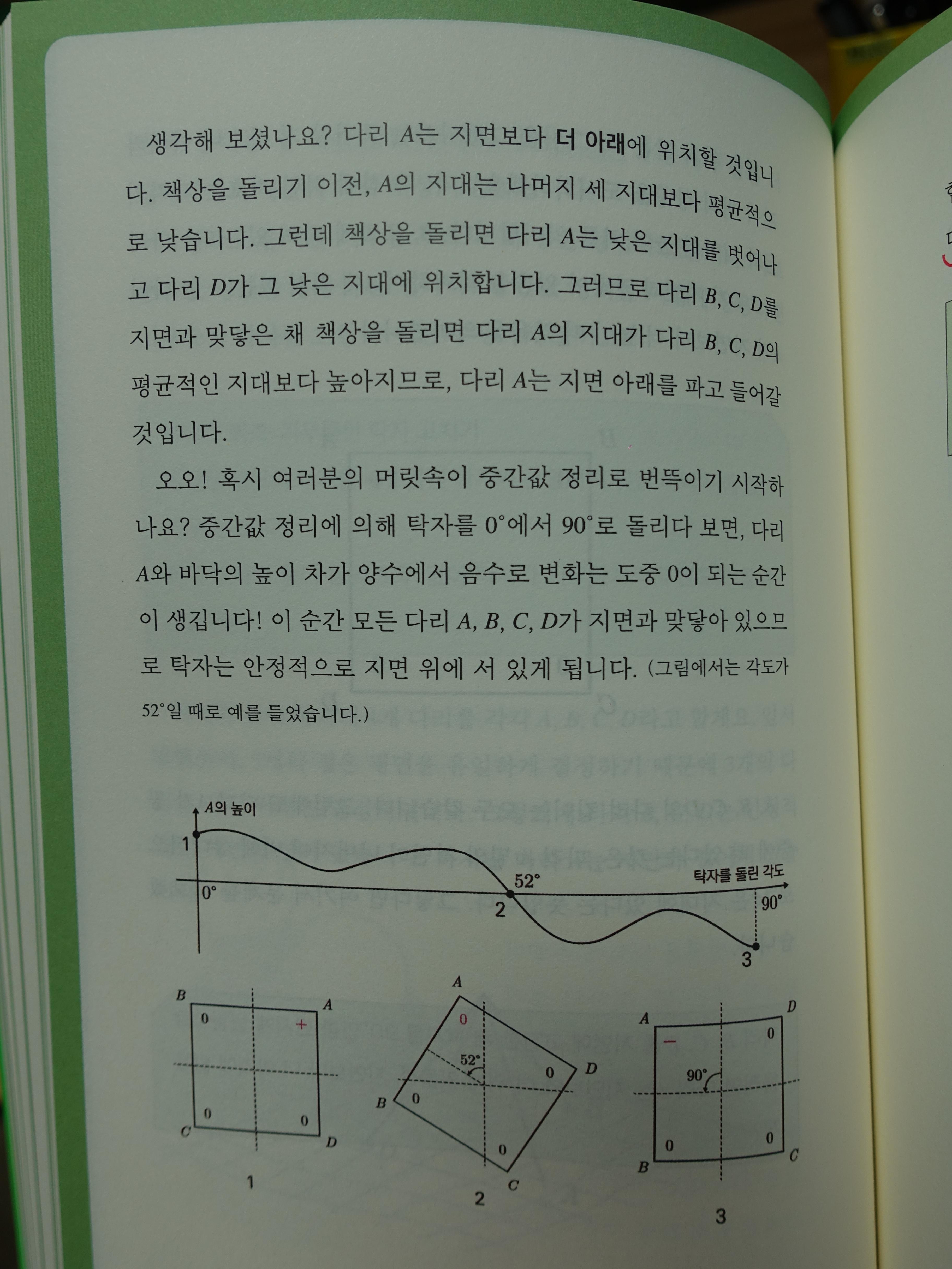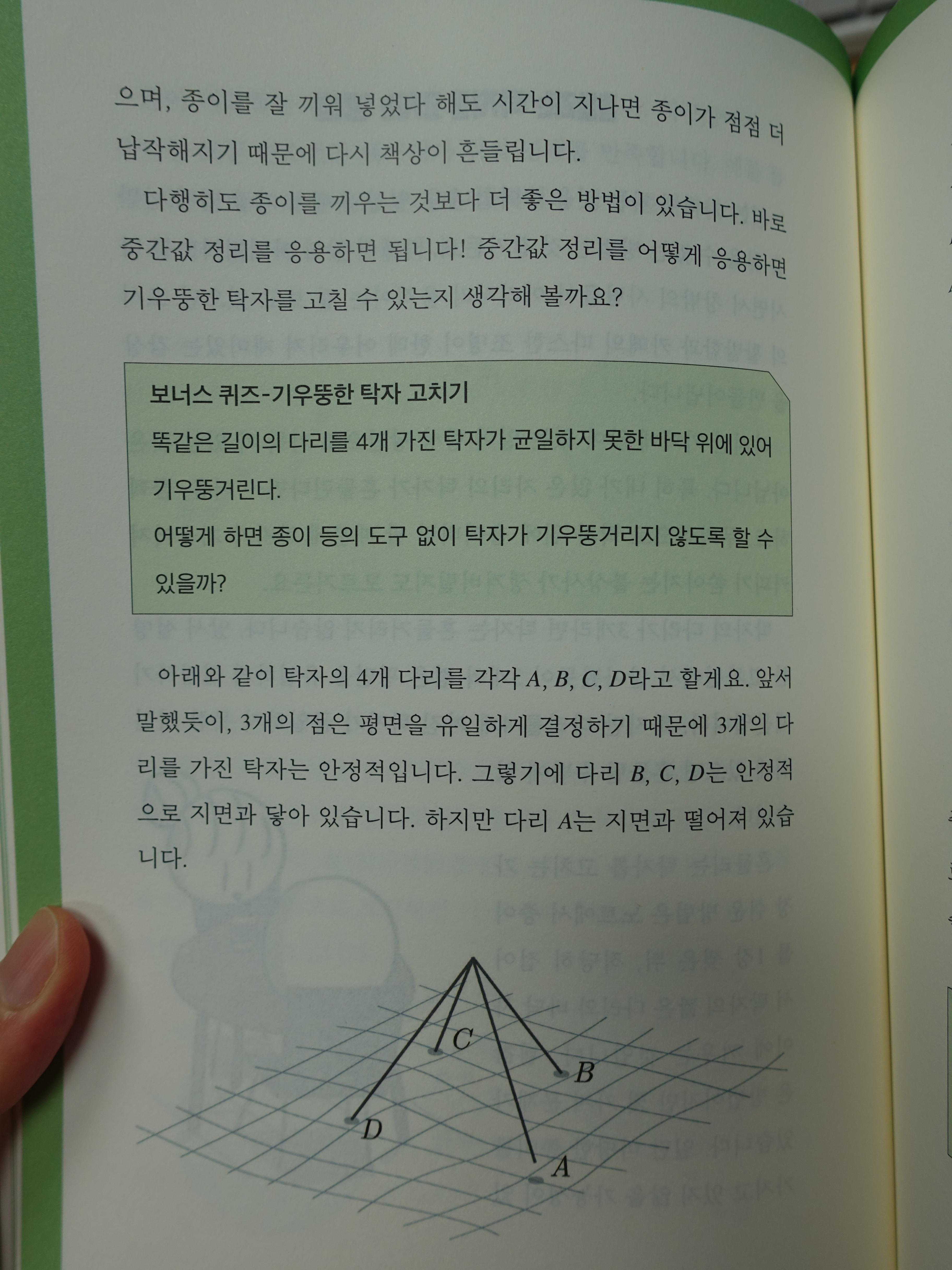 기우뚱한 탁자 고치기 - 이게 보통 그냥 실생활 팁 정도로 책에 다뤄지는 내용인데, 사잇값 정리를 이용하여 꽤 상세하게 설명해줍니다. 이런 것 넘 좋아요.ㅎㅎ