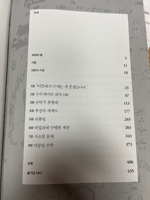 책 전체적으로 어떤 느낌인지 보시라고 동영상 찍어봤어요. 꽤나 두껍지만 매우 즐겁게 읽을 수 있습니다. 중간에 수학자들의 사진이나 그림이 있는 것도 전 재밌더라고요.ㅎㅎ
