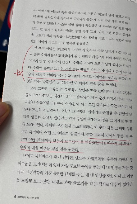 앤드류 와일즈가 페르마의 정리를 해결하기 위해 얼마나 노력했는지 잘 기록되어 있습니다. 즉 똑똑한 수학자라고 그냥 바로 수학 문제를 푸는 것이 아닌, 수학에 대한 열정과 인내를 갖고 노력하는 게 얼마나 중요한지를 보여주죠.