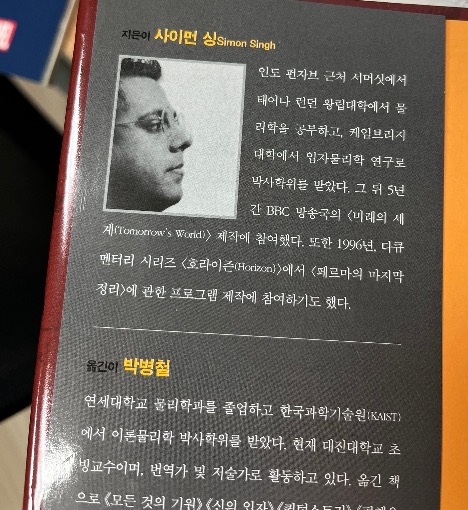 사이먼 싱이 쓴 책으로, 17세기에 처음 제시된 이후 오랜 기간 동안 해결되지 못했던 난제 중 하나인 '페르마의 정리'에 대한 내용입니다. 그렇다고 앤드류 와일스 자서전..까지는 아니고 페르마의 정리를 소재로 수학적인 소재들을 꽤나 다양하게 소개해주면서 이 정리가 어떻게 증명 되었는가?!를 보여주는 책이죠.