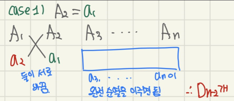 이 경우는 나머지 A3부터 An까지 n-2개의 원소들이 완전순열(교란순열)을 이루면 됩니다.