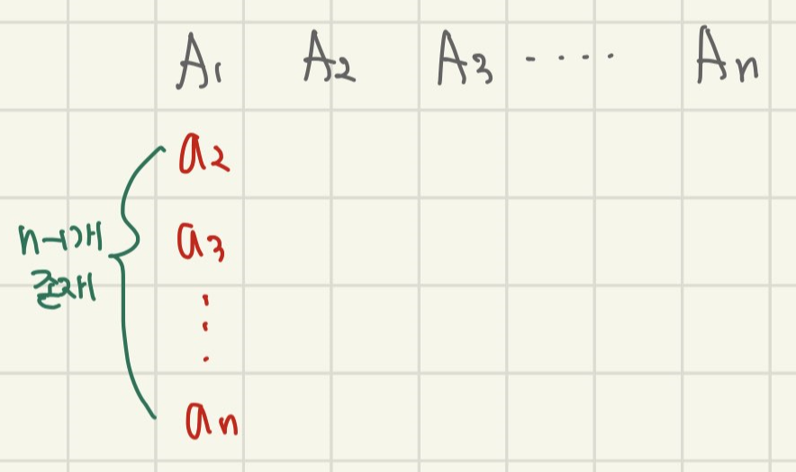 먼저 A1의 경우, a1을 제외한 나머지 (n-1)개의 원소가 올 수 있습니다.