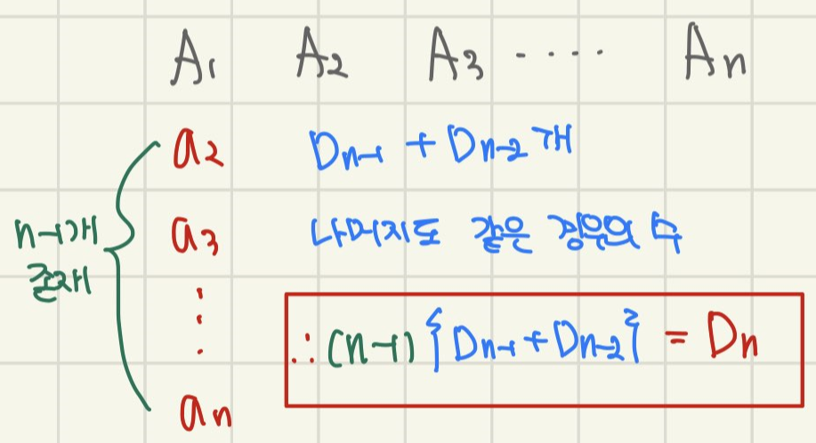 정리 해볼까요? A1=a2인 경우에는 Case1) + Case2) 의 두 경우를 고려해주면 됩니다. 그런데 나머지 경우도 똑같은 수가 나오죠.!! 따라서 정리하면 D(n) = (n-1){D(n-1)+D(n-2)}가 됩니다.