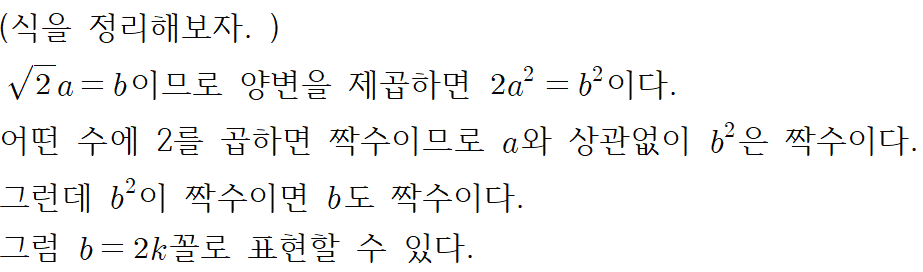 말이 안됩니다. 그러니, 무리수가 아니라고 하면(유리수라고 가정하면) 말이 안되니까(모순이니까) 참임을 보입시다.