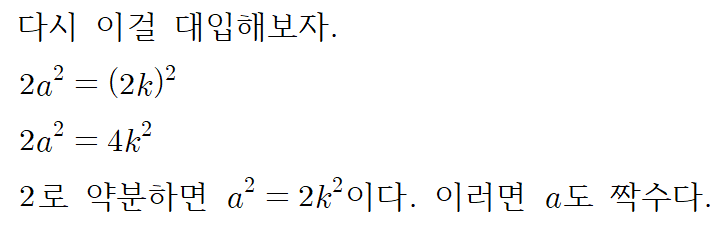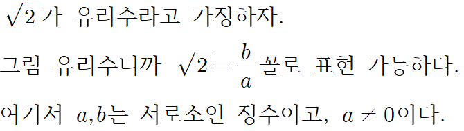 말이 안됩니다. 그러니, 무리수가 아니라고 하면(유리수라고 가정하면) 말이 안되니까(모순이니까) 참임을 보입시다.