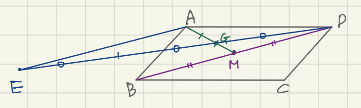 평행사변형 ABCD의 대각선 BD의 중점을 M, △ABD의 무게중심을 G라고 하고, 선분 GD를 2:3으로 외분하는 점을 E라고 하자. △AED의 넓이는 △DGM의 넓이의 k배이다. 이때 k를 구하고 그 풀이과정을 서술하시오.