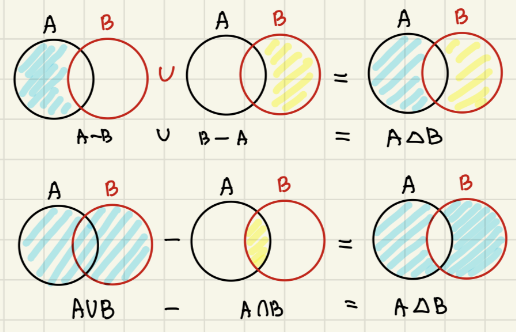 대칭차집합은 수식으로 쓰면 여러가지 방법으로 표현할 수 있기 때문에, 이것이 대칭차집합이다-라고 알아볼 수 있으면 됩니다.