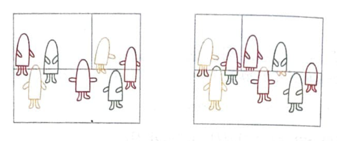 사실 종이가 맞닿는 부분을 살펴보면, 오른쪽의 사람들이 조금씩 더 짧은 것이 보이나요?