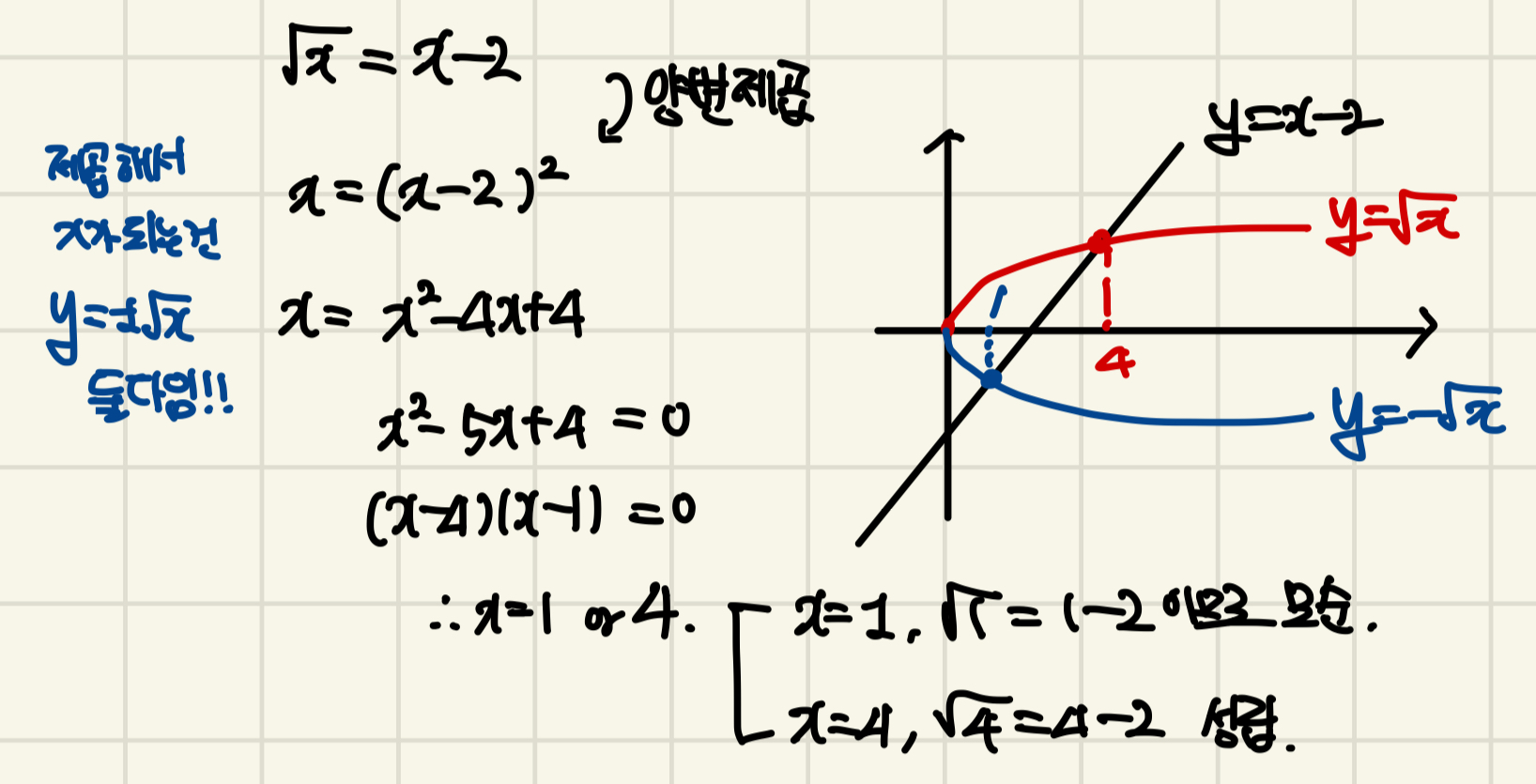 그건 바로 식을 제곱하는 과정에서 나옵니다. 우리가 양변을 제곱할 때, 제곱해서 x가 나오는 식은 두 개가 있기 때문이죠. 그래서 그래프로 본다면, 원래는 √x=x의 해만 구해야 하는 걸, -√x=x의 해까지 같이 구해버린 것입니다.