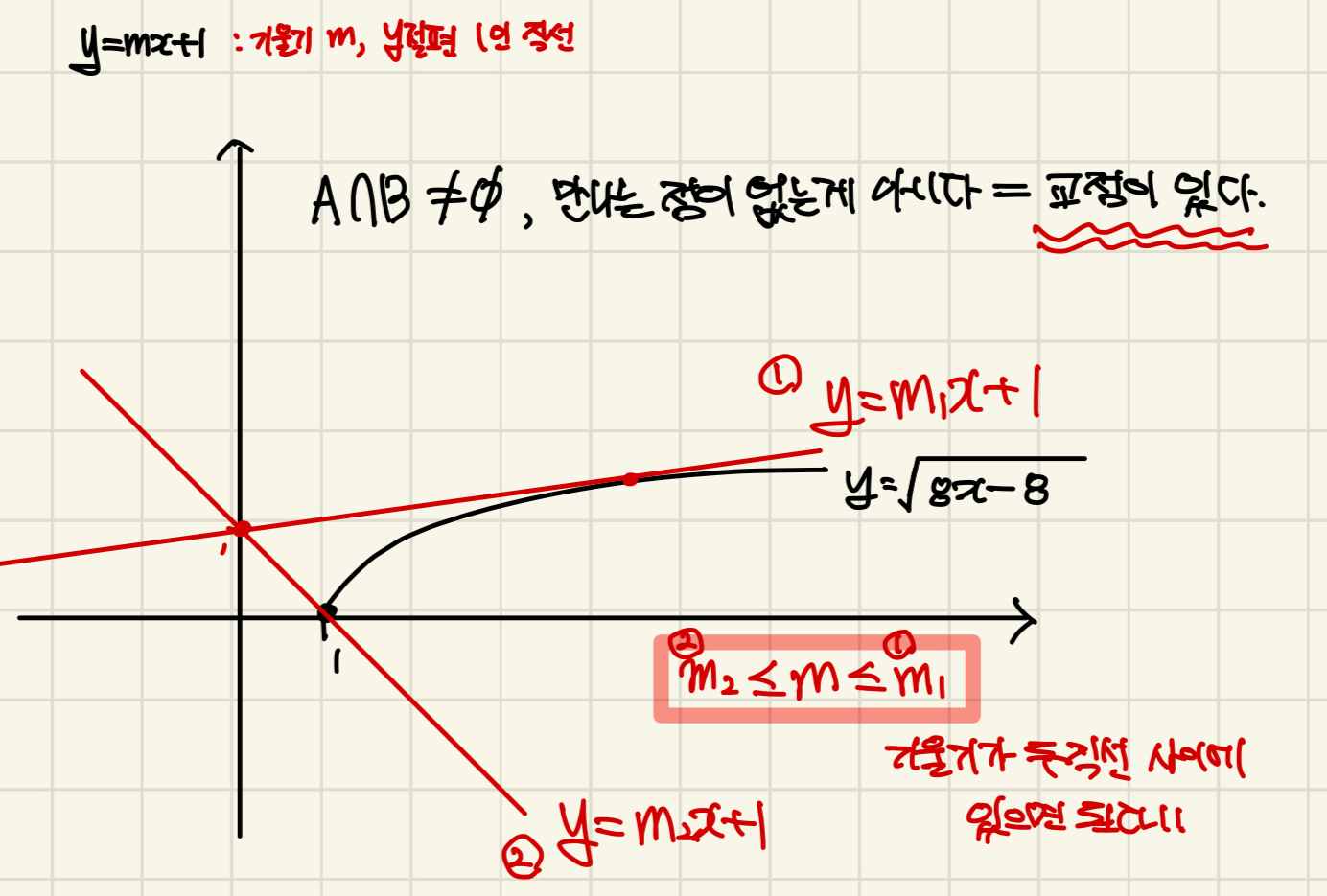 1. 무리함수와 직선의 위치관계는 반드시 그래프를 그려서 푼다.