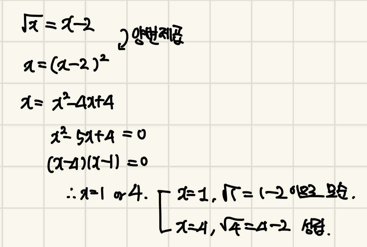 분명 이차방정식을 풀었을 때는 해가 1, 4 두 개가 나오는데, 이 걸 원래의 식에 다시 대입해보면, 답이 하나만 나옵니다. 왜 그럴까요?