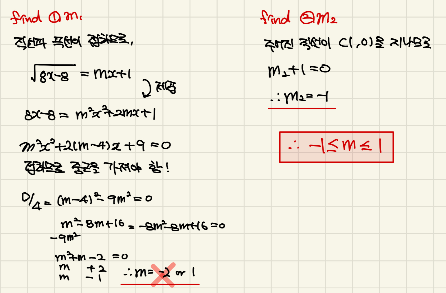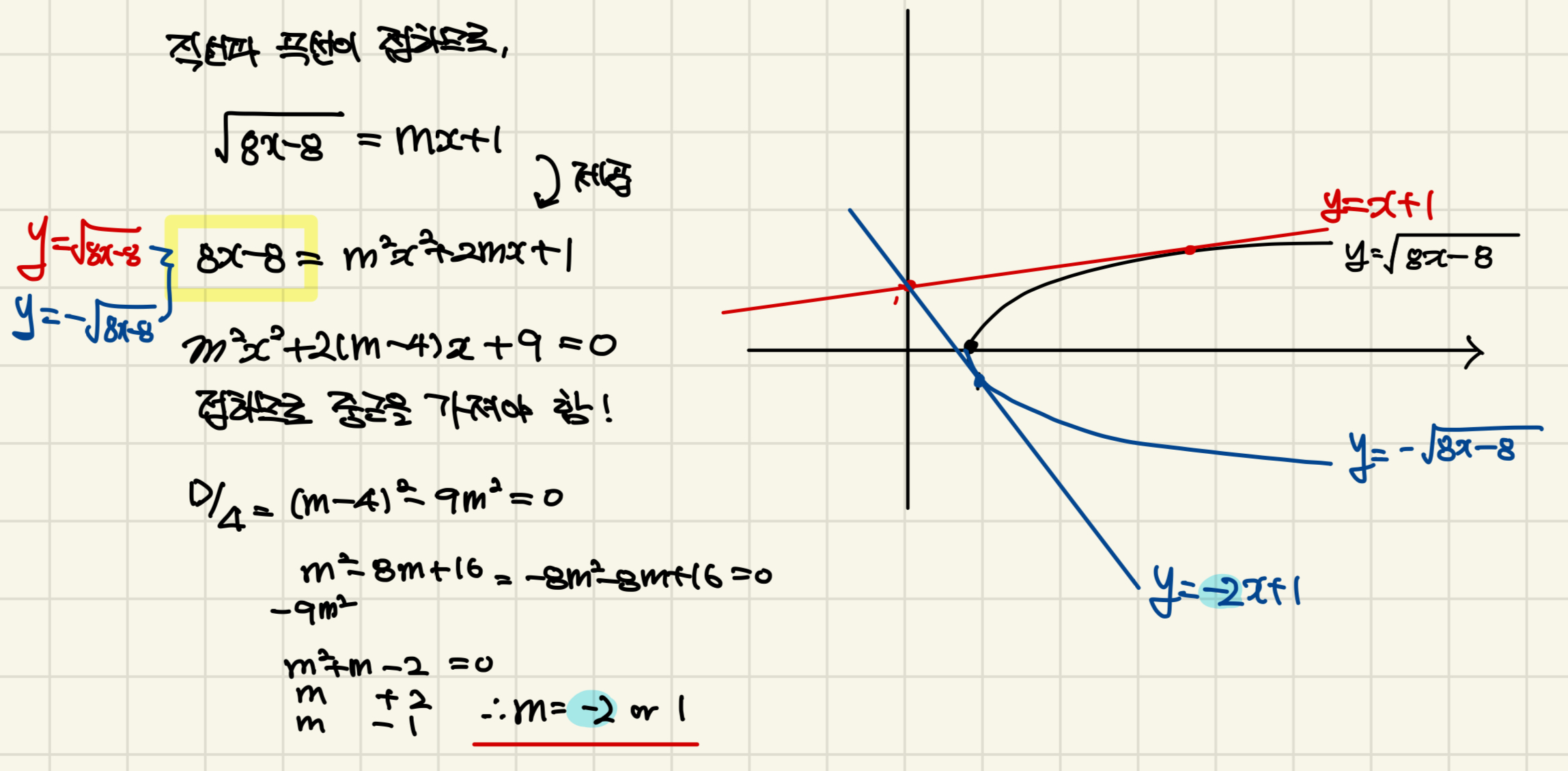 만약 정답이 -2≤m≤1이라고 나왔다면 높은 확률로 아마 그래프 안 그리고, 판별식만 이용해서 푸셨을 겁니다.