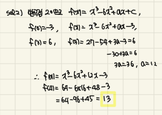 뭐, 최고차 계수와 변곡점을 아는데다, f의 함숫값을 아니까.. 아래와 같이 바로 세워서 풀어도 됩니다.