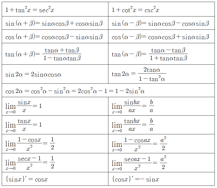 미적분은 외워야 할 공식이 한 두가지가 아니죠. 워낙 양이 많다보니, '미적분 공식은 다외웠니?'라고 물어보면서도 체크해야 할 게 너무 많더라고요. 그래서 간단하게 포스팅 남겨봅니다. 완전 기본적인 내용은 제외했습니다. 아래 내용 정도는 숙지해주셔야 합니다.