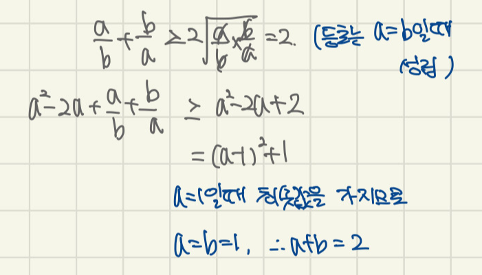 두 식의 등호 조건이 달라서 이 둘을 동시에 만족하는 a, b는 존재하지 않습니다.