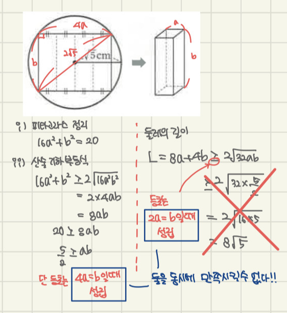 산술기하 부등식을 풀 때, 최댓값 or 최솟값을 구할 때, 반드시 등호 조건이 성립하는지 따져보셔야 합니다.