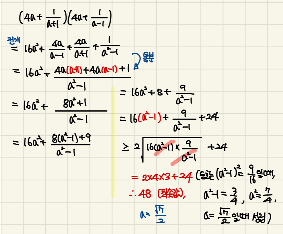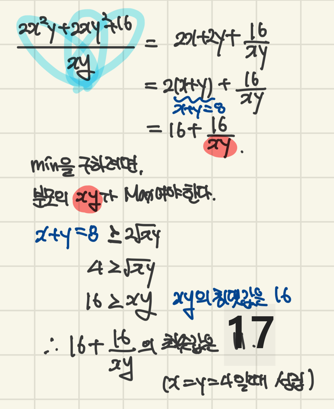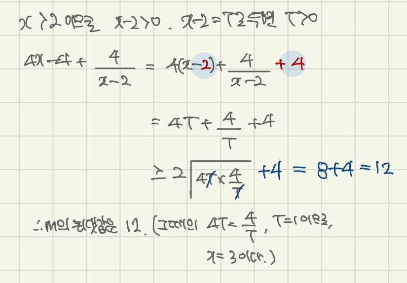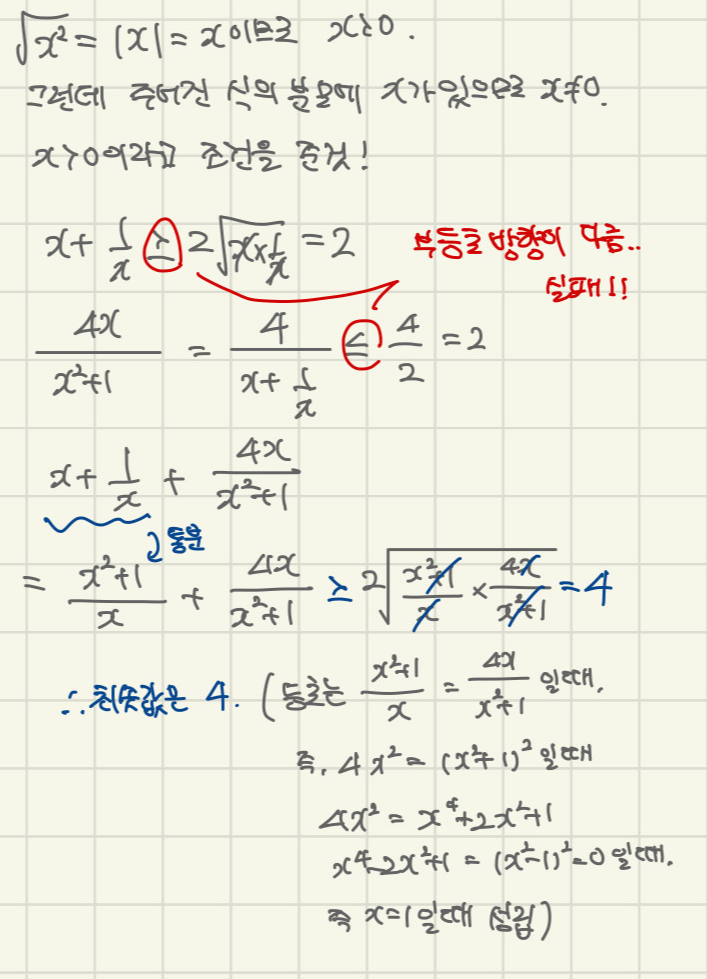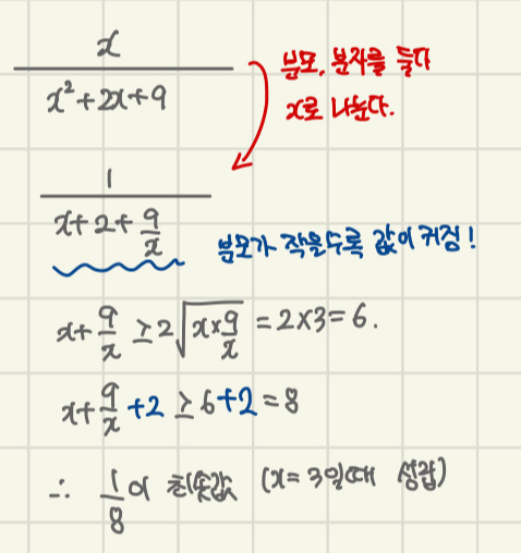 그래서 산술기하 부등식을 사용할 때, 꼭 등호 조건을 같이 구해보는 걸 습관으로 들이셔야 해요!