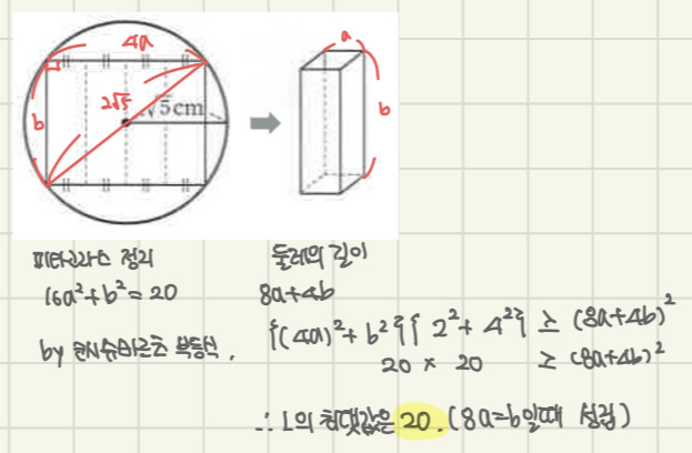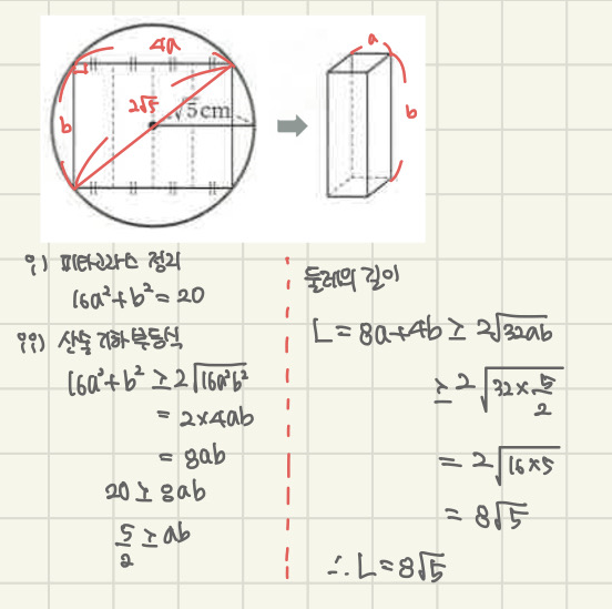 피타고라스의 정리와 산술기하 부등식을 이용해서 아래와 같이 풀어보았습니다.