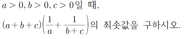 그럼 이제 위의 문제는 어떻게 푸냐고요? 이건 아래와 같이 코시 슈바르츠 부등식을 사용해서 푸시면 됩니다.