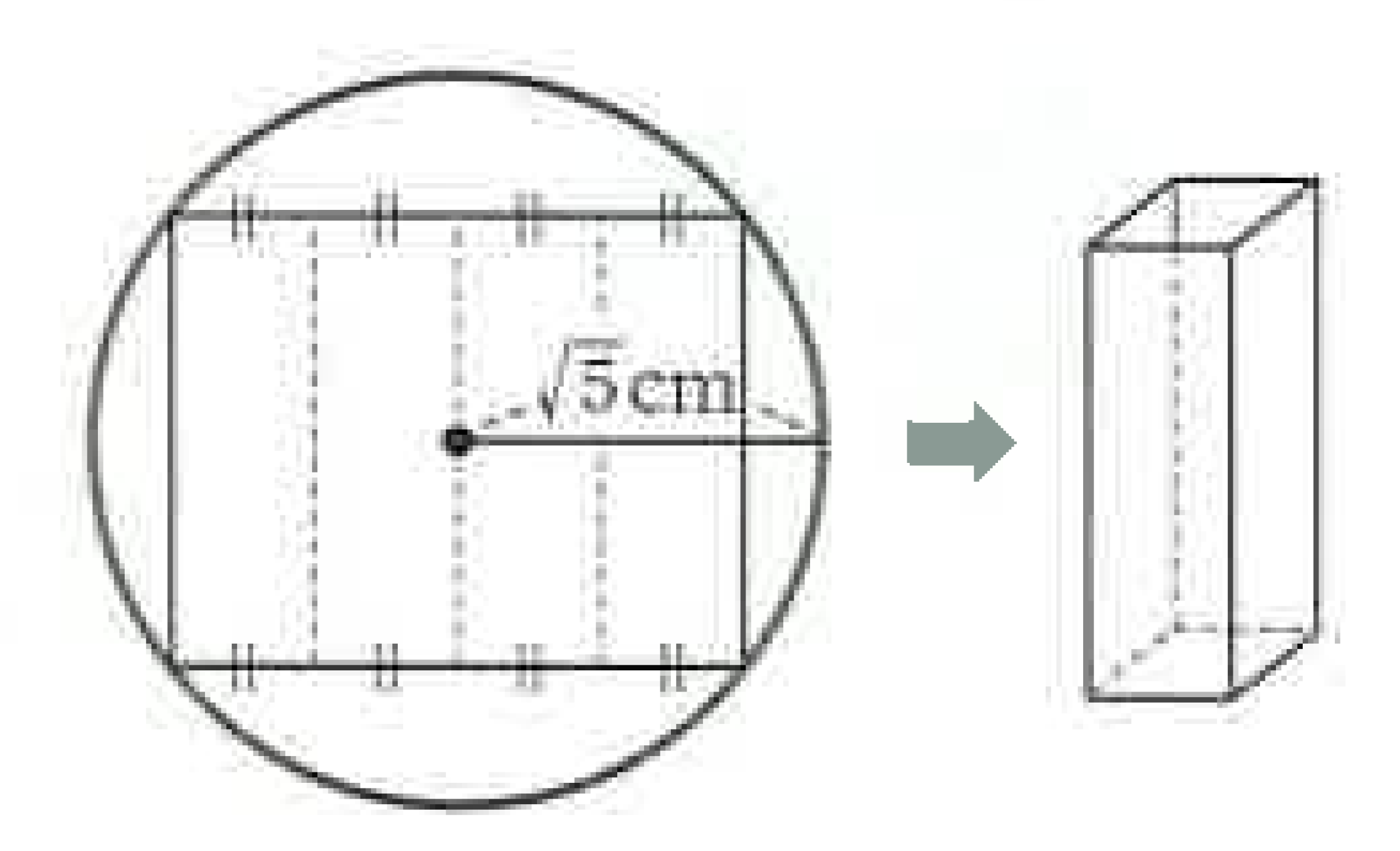 종이 위에 반지름의 길이가 √5cm인 원을 그리고 이 원에 내접하는 직사각형을 잘라내어 아래 그림과 같이 점선을 따라 접어 윗면과 밑면이 없는 정사각기둥 모양의 상자를 만들려고 한다. 정사각기둥의 모든 모서리의 길이의 합을 Lcm라고 할 때 L의 최댓값을 구하여라.