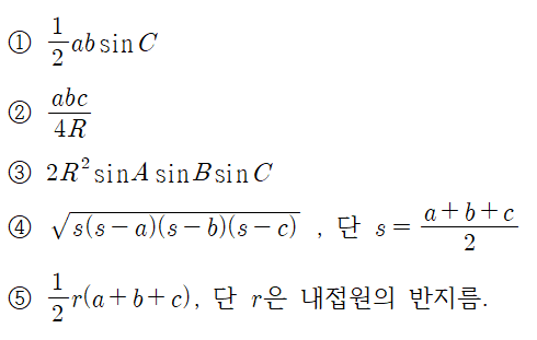 헤론의 공식이라고 불리는 4번째 공식입니다. 세 변의 길이의 합이 짝수라면 굉장히 간단하게 연산이 되죠. 물론 아닐 때도 얼마든지 사용 가능합니다 :-) 넓이를 구하는데 있어 각을 몰라도 되기 때문에 손쉽게 구할 수 있죠.