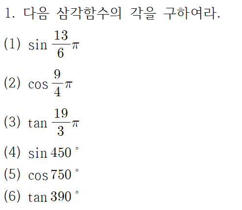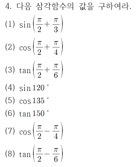 교재에 실려 있는 삼각함수의 각 변환 공식 문제가 연습용으로 충분치 않은 것 같아서 싸그리 모아봤습니다.