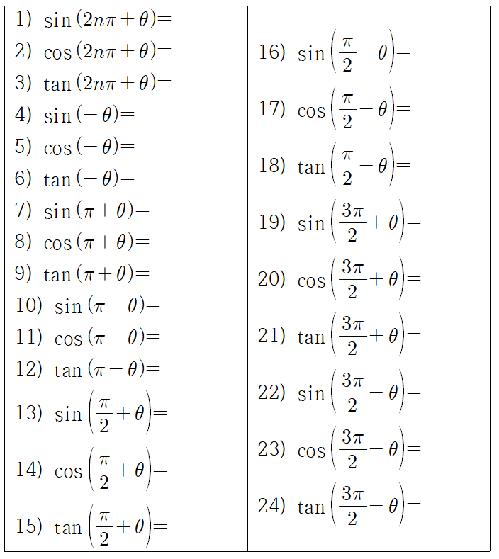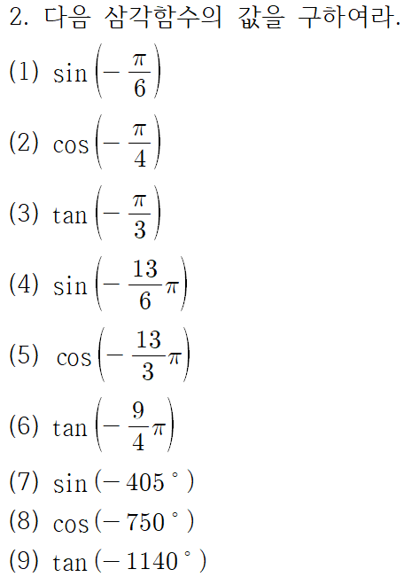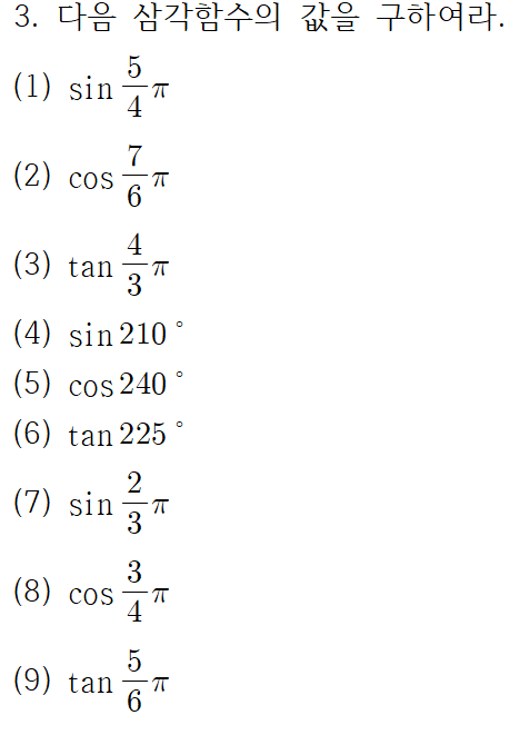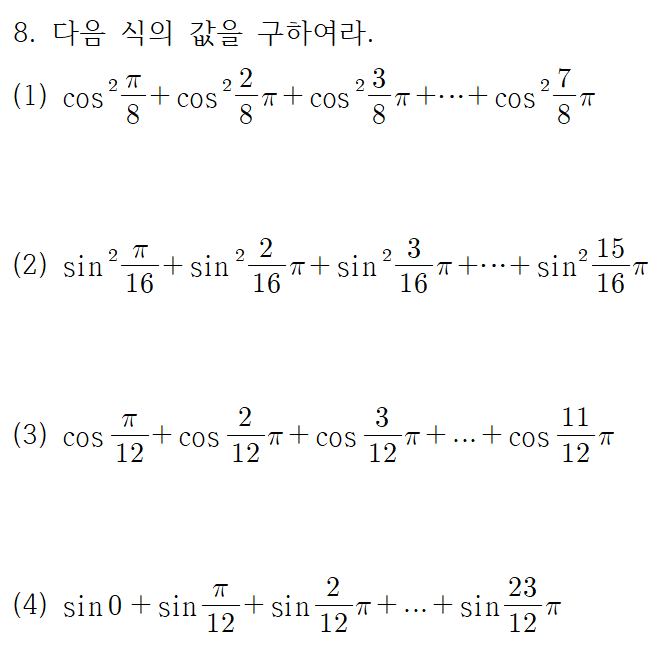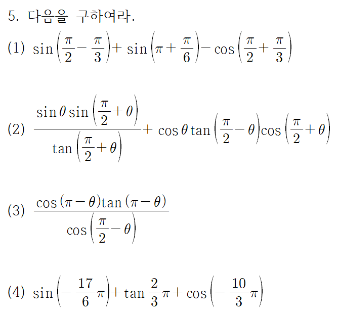 교재에 실려 있는 삼각함수의 각 변환 공식 문제가 연습용으로 충분치 않은 것 같아서 싸그리 모아봤습니다.