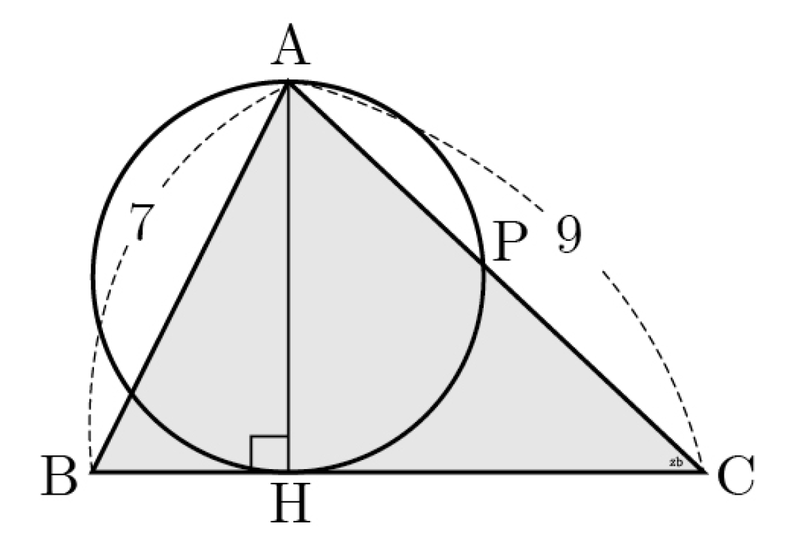 아래 그림과 같이 AB=7, AC=9, sin(∠BAC)=(4√3)/7 인 삼각형 ABC의 꼭짓점 A에서 선분 BC에 내린 수선의 발을 H라 하자. 선분 AH를 지름으로 하는 원이 선분 AC와 만나는 점 중 A가 아닌 점을 P라 할 때, 선분 CP의 길이는? (단, ∠BAC는 예각)