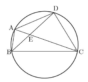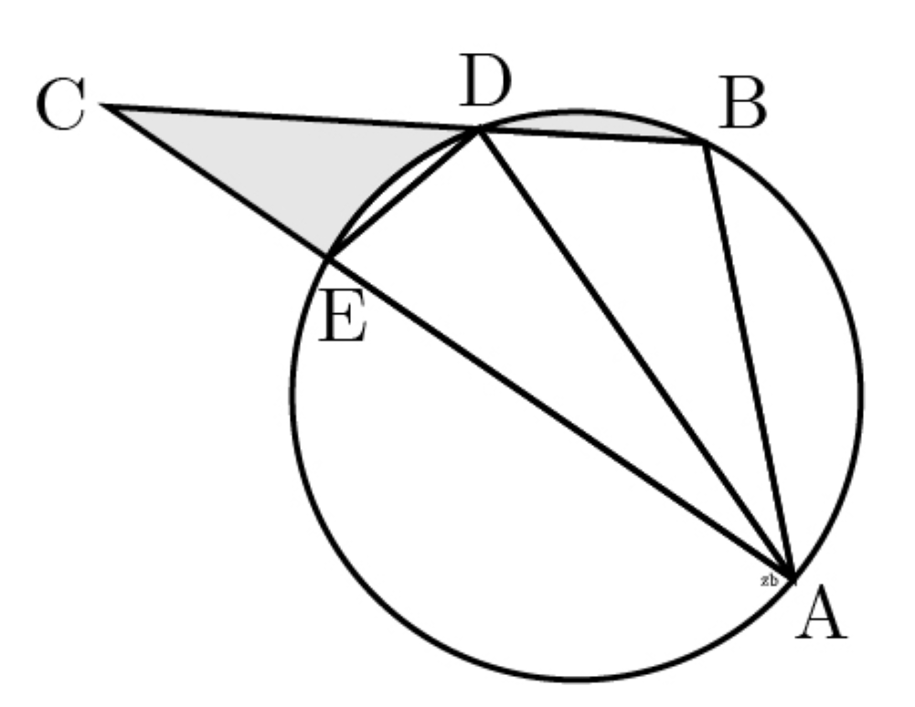 아래 그림과 같이 AB=2, AC=5이고, ∠CAB=60º인 삼각형 ABC가 있다. ∠CAB의 이등분선이 원과 만나는 점을 D, 선분 AC가 원과 만나는 점을 E라 할 때, 두 선분 CD, CE와 호 DE로 둘러싸인 부분과 선분 BD와 호 BD로 둘러싸인 부분의 넓이의 합을 구하시오.