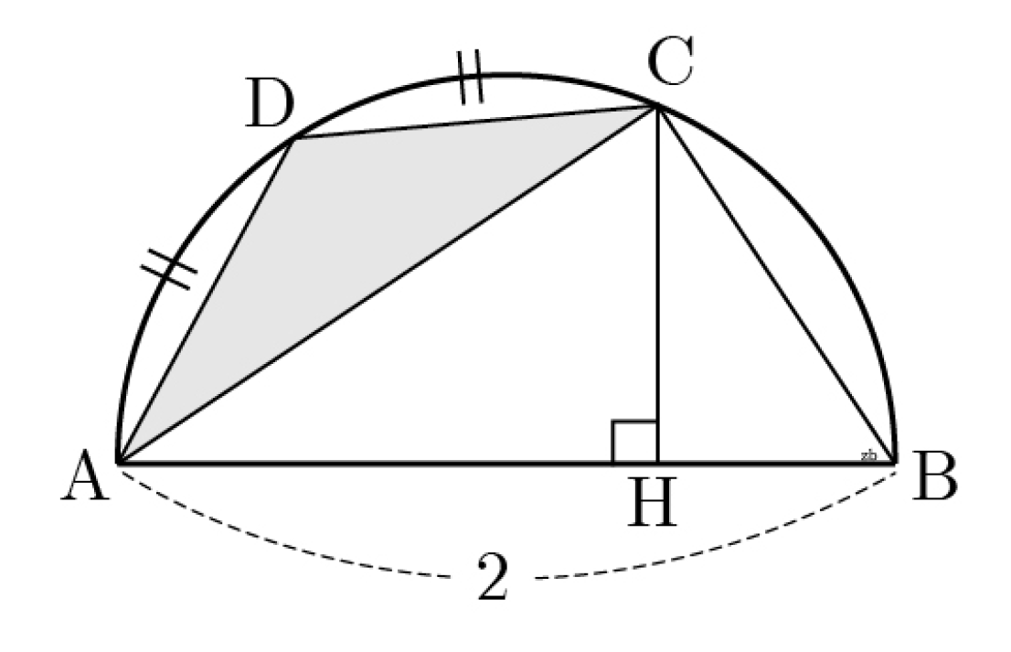 그림과 같이 길이가 2인 선분 AB를 지름으로 하는 반원의 호 AB 위를 움직이는 점 C가 있다. 점 C에서 선분 AB에 내린 수선의 발을 H, 호AC의 중점을 D라 하고, △ABC의 넓이를 S, △BCH의 넓이를 T라 하자. S:T=9:4일 때, △ACD의 넓이를 구하시오.