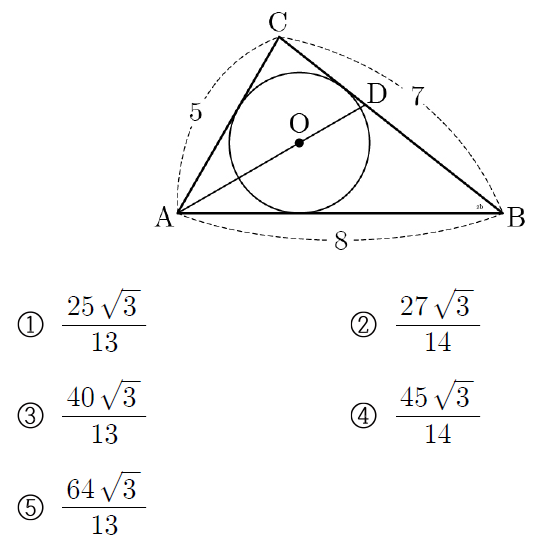 그림과 같이 AB=8, BC=7, CA=5인 삼각형 ABC에 내접하는 원의 중심을 O라 하자. 직선 AO가 선분 BC와 만나는 점을 D라 할 때, 선분 AD의 길이는?