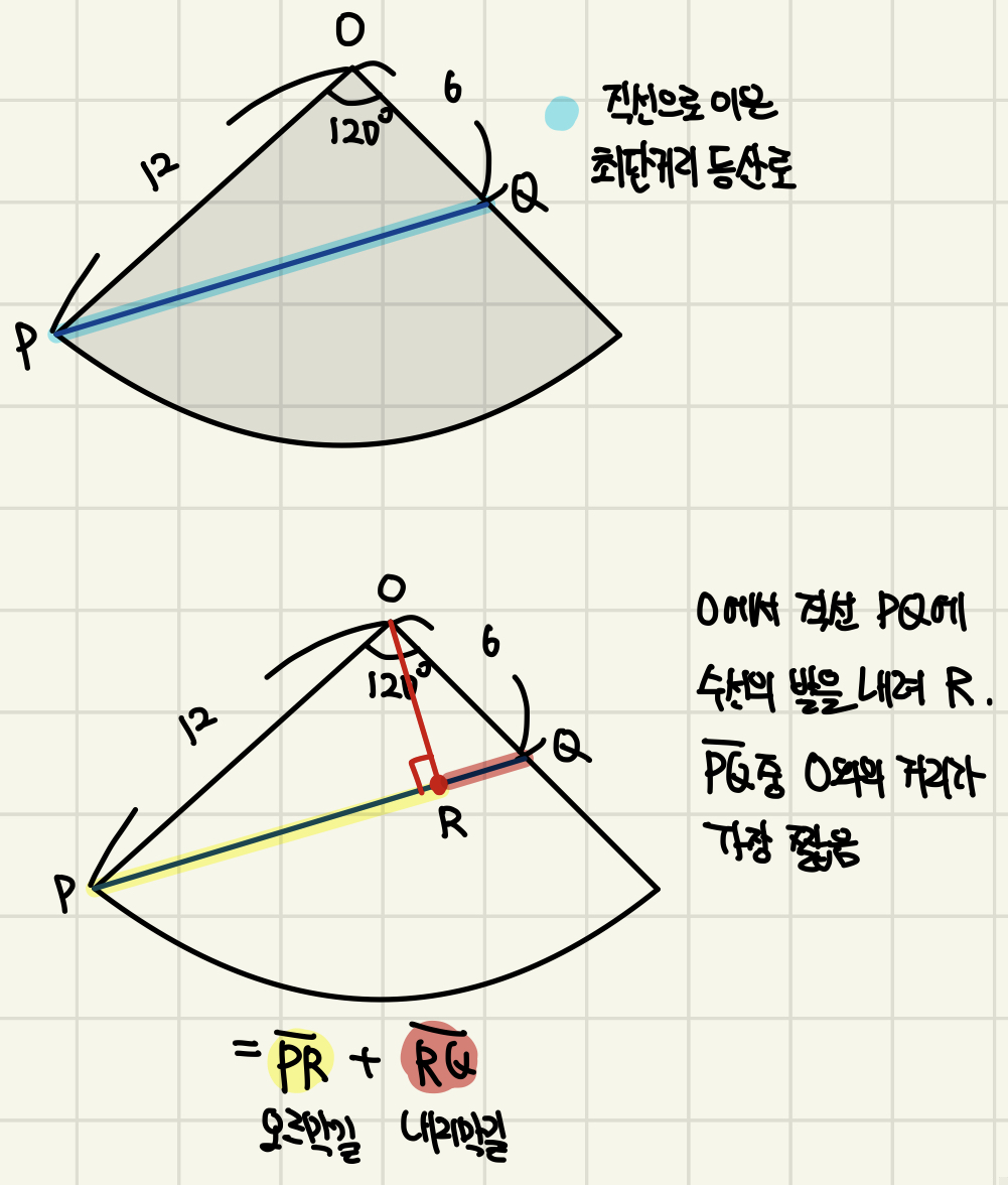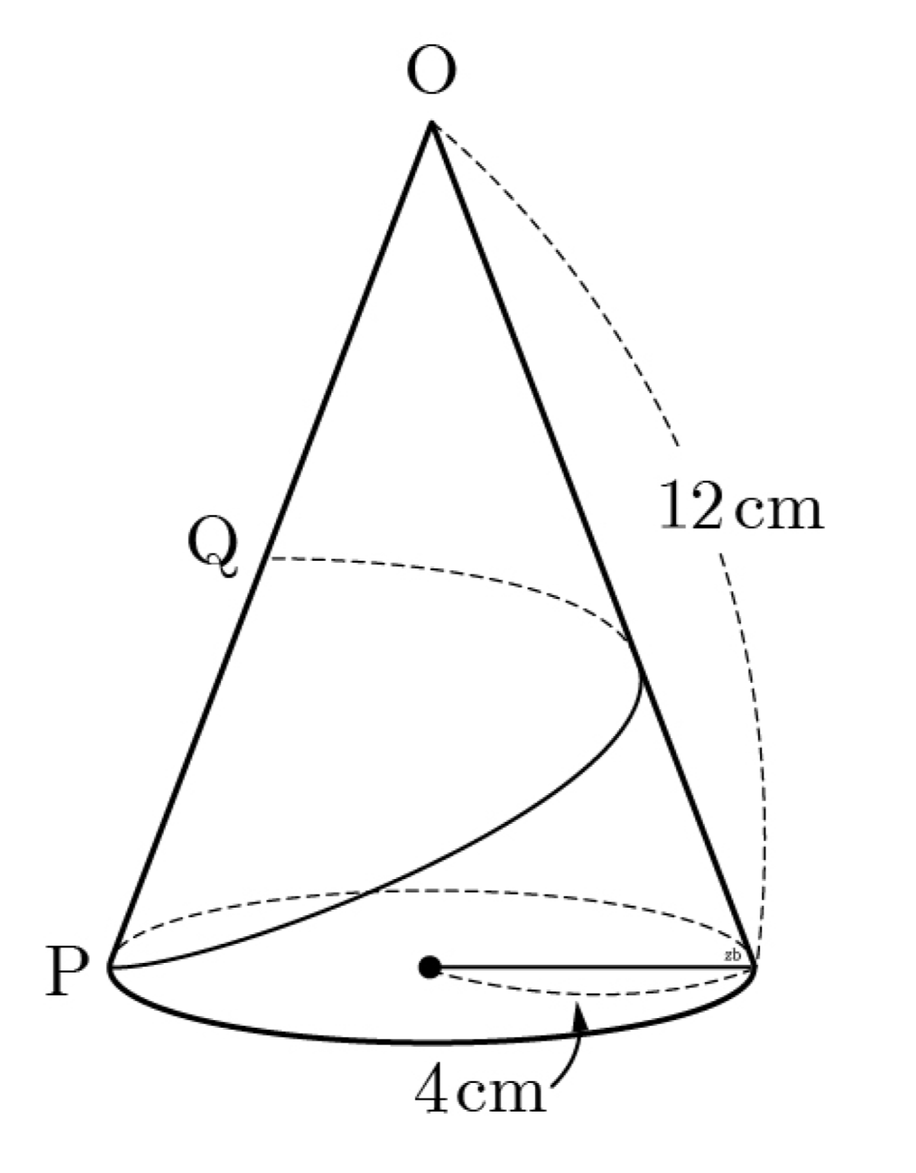 그림과 같이 밑면의 반지름의 길이가 4cm이고, 모선의 길이가 12cm인 원뿔이 있다. 원뿔의 밑면인 원의 둘레 위의 점 P에서 모선 OP의 중점 Q까지 원뿔의 표면을 따라 최단 거리로 개미 한 마리가 기어갈 때 어느 지점까지는 오르막길이고 이후 내리막길이 된다. 오르막길의 거리를 구하시오.