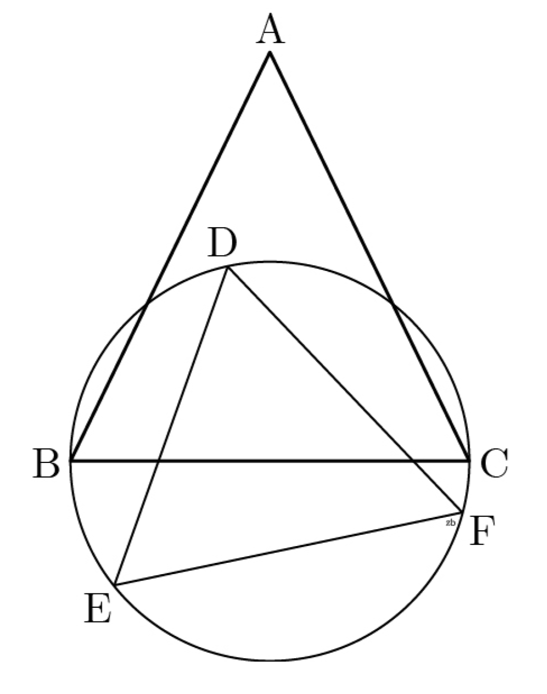AB=AC=6√6 + 6√2 인 이등변삼각형 ABC가 있다. ∠BAC=30º이고, 선분 BC를 지름으로 하는 원이 있다. 이 원에 내접하는 삼각형 DEF의 면적이 54일 때, EF=d, DF=e, DE=f라 하자. d×e×f의 값을 구하시오.