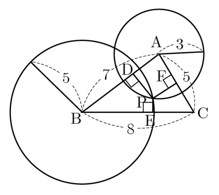 그림과 같이 AB=7, BC=8, CA=5인 삼각형 ABC에서 꼭짓점 A를 중심으로 하고 반지름의 길이가 3인 원과 꼭짓점 B를 중심으로 하고 반지름의 길이가 5인 원이 삼각형 ABC의 내부에서 만나는 점을 P라 하자. 점 P에서 변 AB, BC, CA에 내린 수선의 발을 각각 D, E, F라 할 때, DE+DF의 값은?