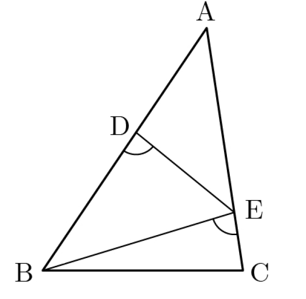 그림과 같이 삼각형 ABC에서 BC=6, AC=8이고, 선분 AB위의 점 D와 선분 AC위의 점 E에 대하여 AE=BE=BC, ∠BDE=∠BEC를 만족한다. 이때, 선분 DE의 길이를 구하시오.