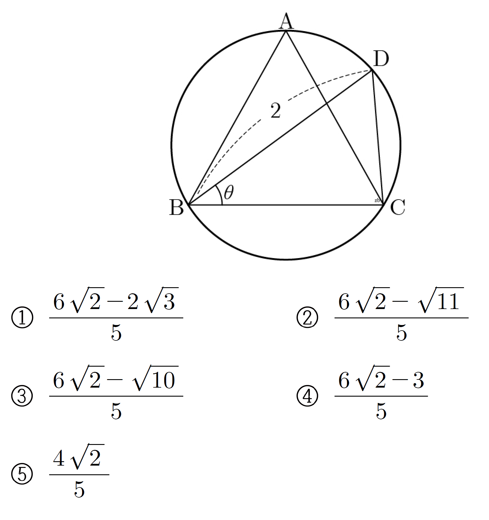 정삼각형 ABC가 반지름의 길이가 r인 원에 내접하고 있다. 선분 AC와 선분 BD가 만나고 BD=2가 되도록 원 위에 점 D를 잡는다. ∠DBC=θ라 할 때, sinθ=√3 / 3이다. 반지름의 길이 r의 값은?