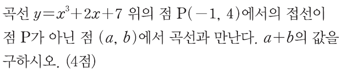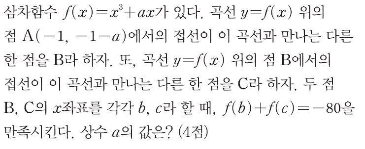 삼차함수에서 접선과 함수가 다시 만나는 점의 좌표는, 세 근의 합을 이용하여 바로 구할 수 있습니다. :-) 이 유형은 은근 자주 쓰이기 때문에 꼭 익혀두시는 편이 좋습니다. 먼저 원리를 가볍게 증명하고 문제를 같이 풀어보도록 해요!