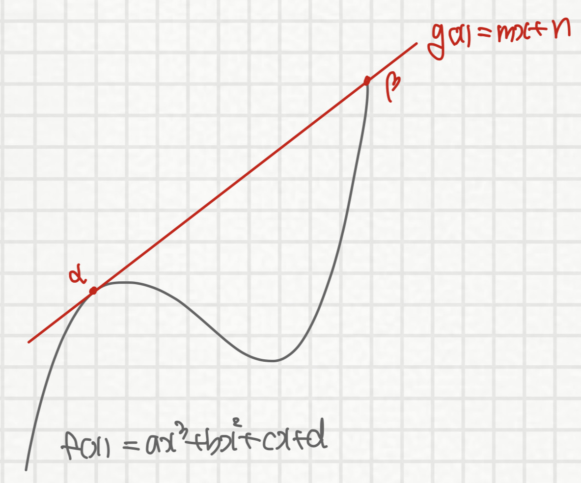 먼저 아래와 같이 삼차함수를 f(x), 접선을 g(x)라 두고, 접점의 좌표를 α(중근), β로 둡시다.