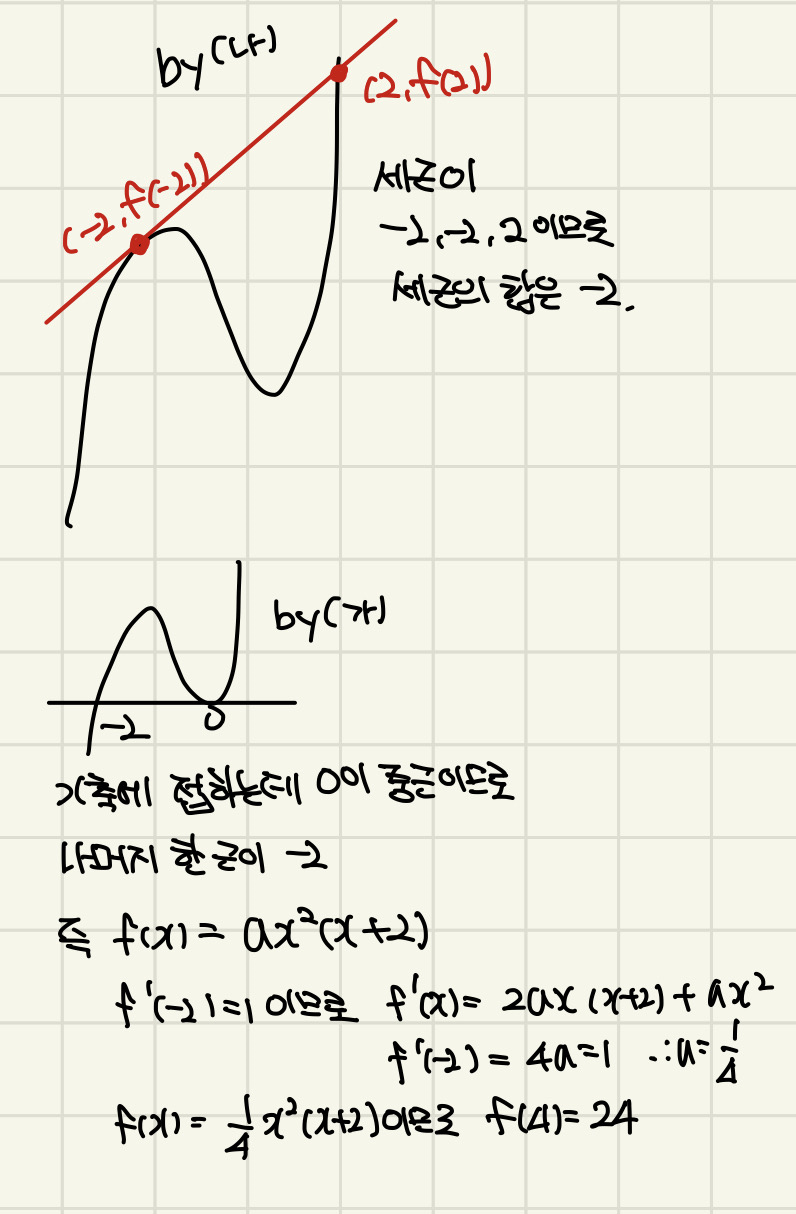 여기서의 핵심은 g(x)가 일차식이기 때문에 f(x)의 삼차항, 이차항의 부호에는 영향을 주지 않는다는 점입니다. 즉, g(x)가 어떤 직선이 되든 간에, f(x)의 삼차항, 이차항 계수에는 영향을 주지 않아서, 세 근의 합은 항상 같죠.