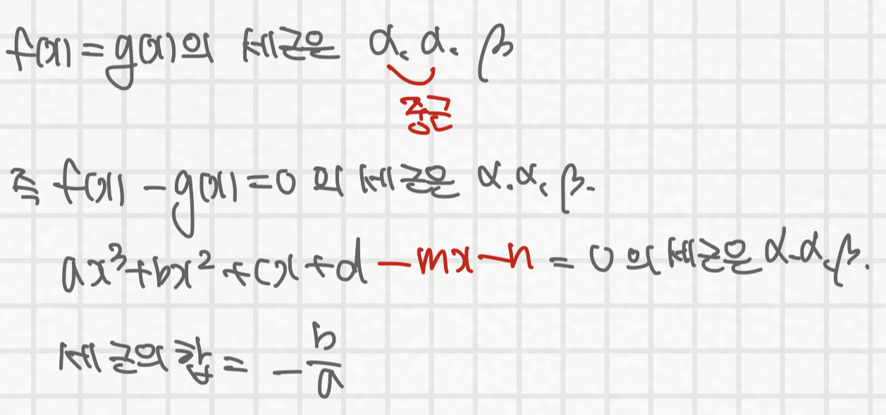즉, 삼차함수와 일차함수의 교점이 α(중근), β입니다. 이는 두 함수식을 연립해서 근을 구하면 됩니다만, 그것도 귀찮기 때문에, 저희는 삼차방정식의 근과 계수와의 관계를 사용할 거에요!