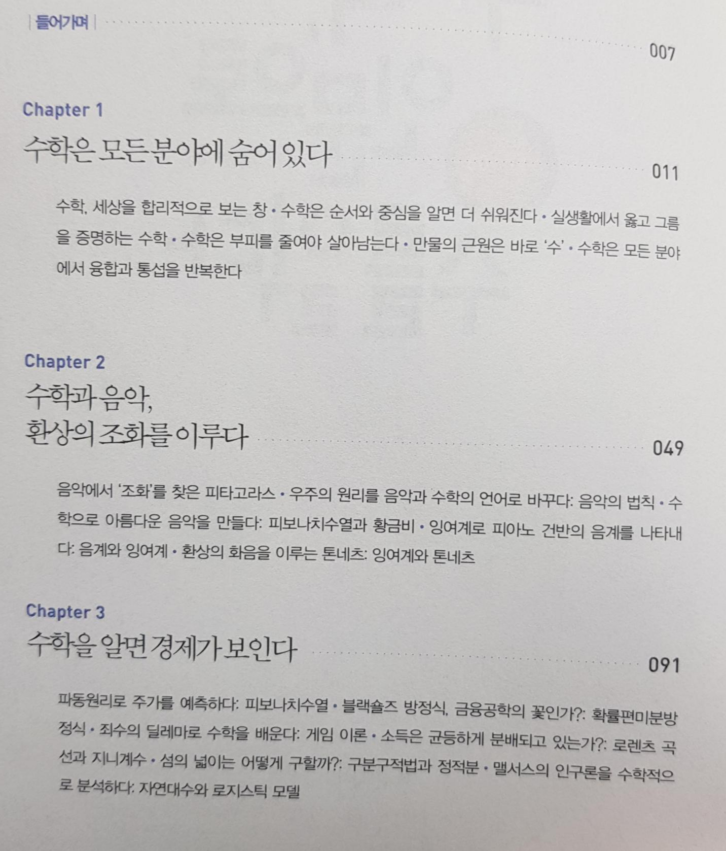 고등학생에게 추천하는 이유는 생기부에 쓰기 매우 좋은 책이기 때문이에요. 특히나 수학 주제 탐구 보고서를 쓰거나, 실생활에서 사용되는 수학 찾기, 수학 발표 주제 찾기에 약간 특화된 책이랄까요? 내용이 다양한데 하나하나가 정말 주옥같습니다. 사실 제가 이 책을 알게 된 계기도 특목고 다니는 제자의 수학 추천 도서 리스트를 보고 접한 거거든요.