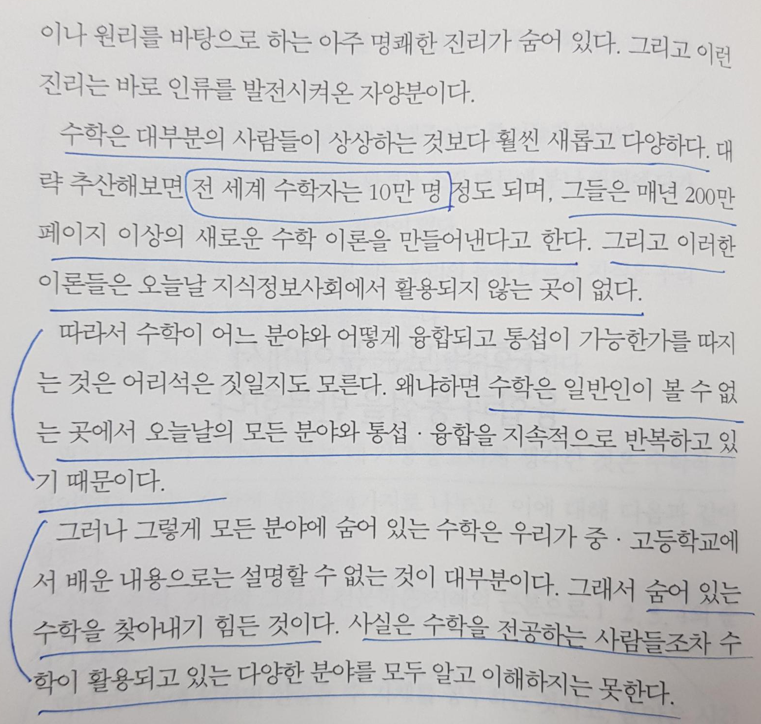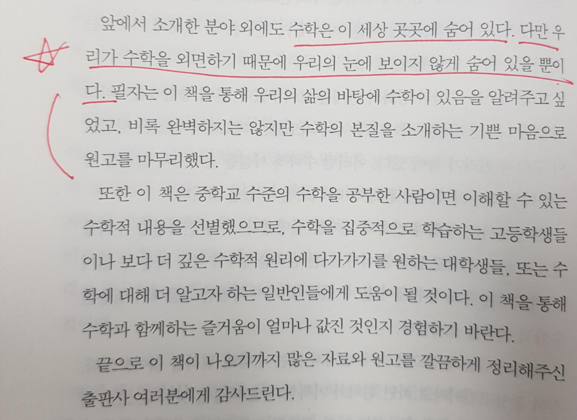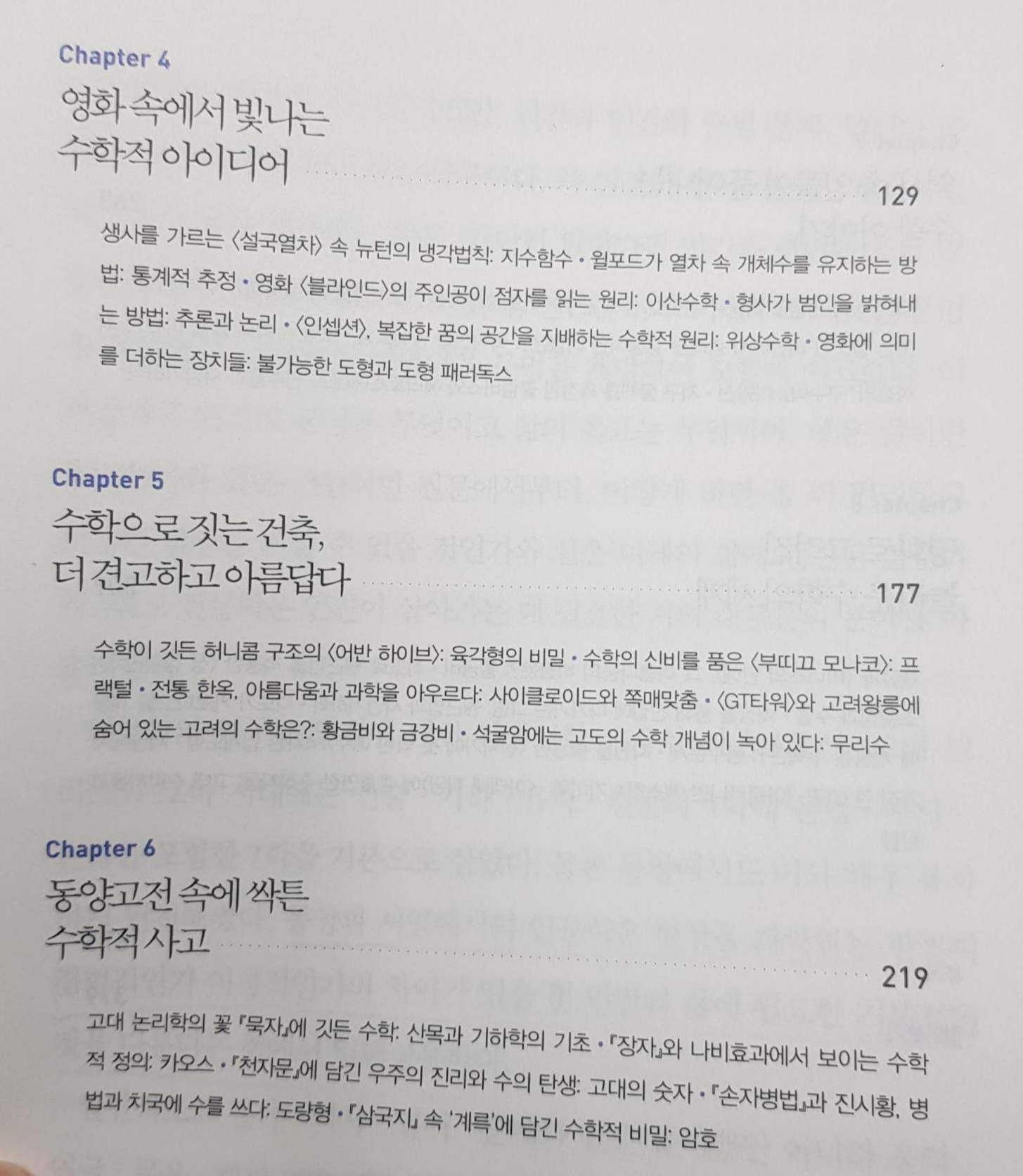 그리고 일단 초/중학생들에게는 비추천합니다.. 분명 저자는 중학교 수준의 수학을 공부한 사람이면 이해할 수 있는 수학적 내용을 선별했다고 썼지만, 책에서 다루는 내용 자체가 배경지식이 많이 필요한 것들이라 개인적인 판단으로 중학생까지는 (특목고 지망생이 아닌 이상) 무리인 것 같다.