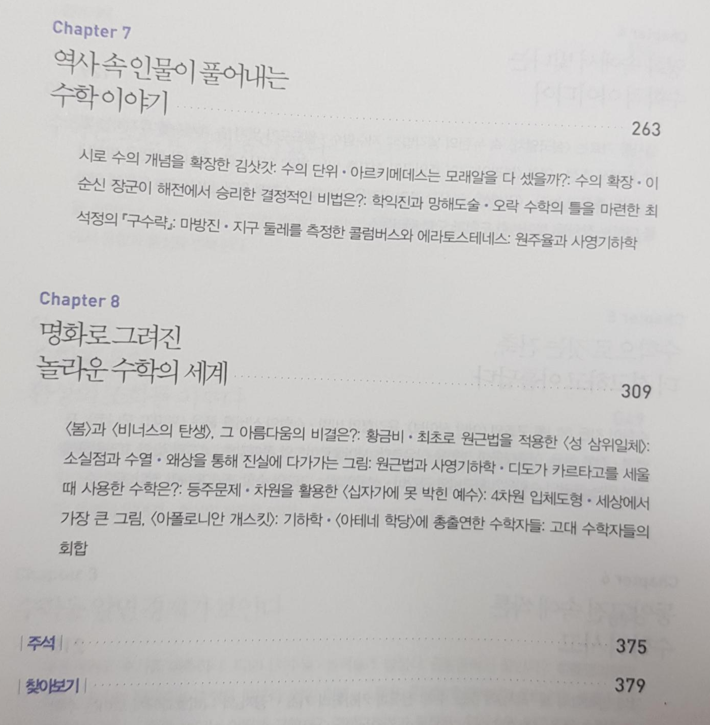 고등학생에게 추천하는 이유는 생기부에 쓰기 매우 좋은 책이기 때문이에요. 특히나 수학 주제 탐구 보고서를 쓰거나, 실생활에서 사용되는 수학 찾기, 수학 발표 주제 찾기에 약간 특화된 책이랄까요? 내용이 다양한데 하나하나가 정말 주옥같습니다. 사실 제가 이 책을 알게 된 계기도 특목고 다니는 제자의 수학 추천 도서 리스트를 보고 접한 거거든요.