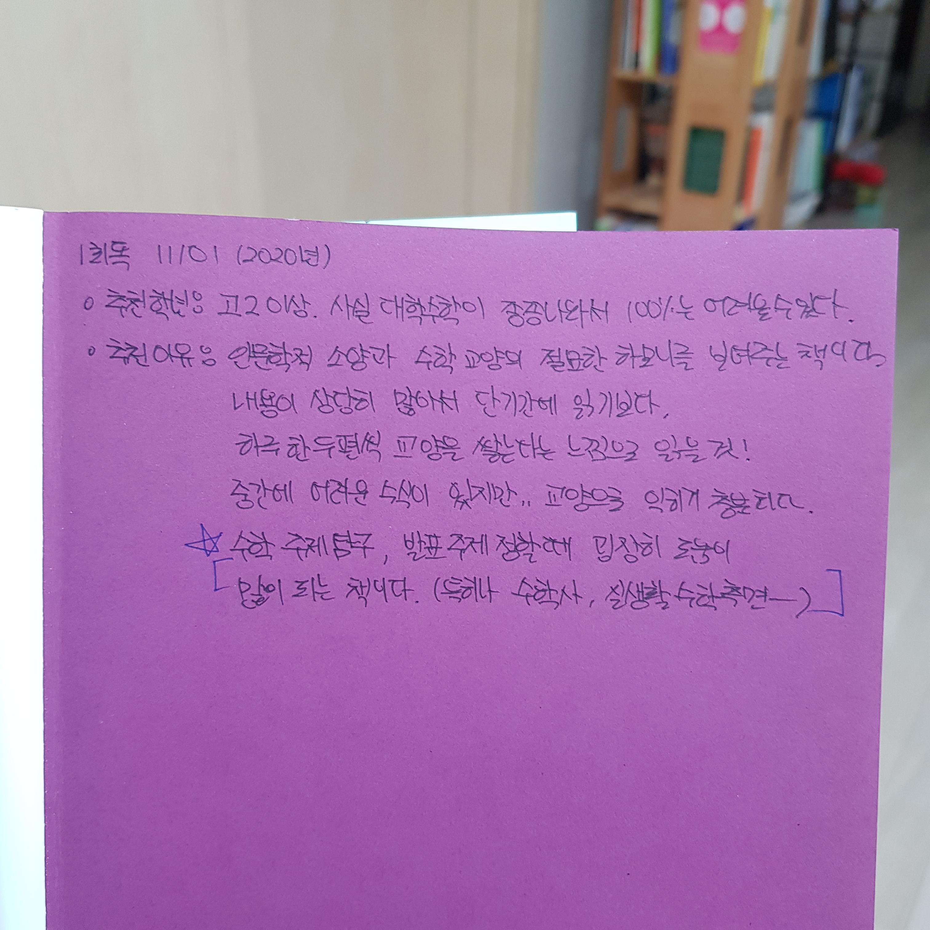 사실 수학적인 내용들이 꽤 많이 나오긴 하는데, 다 읽고 나면 수학책을 읽었다기보다 인문학 교양 서적을 읽었다는 느낌을 더 줍니다. 그래서 상당히 마음에 들어요 :-)