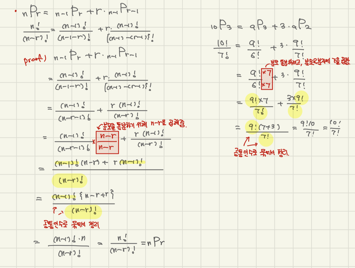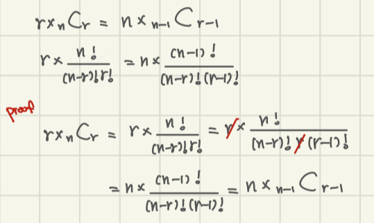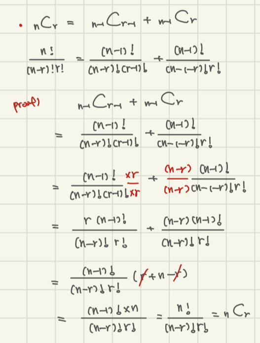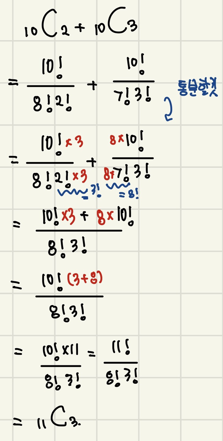조합의 경우도 순열과 마찬가지로 팩토리얼 형태로 다 바꾸어 준 다음 통분해서 식을 증명하시면 됩니다.